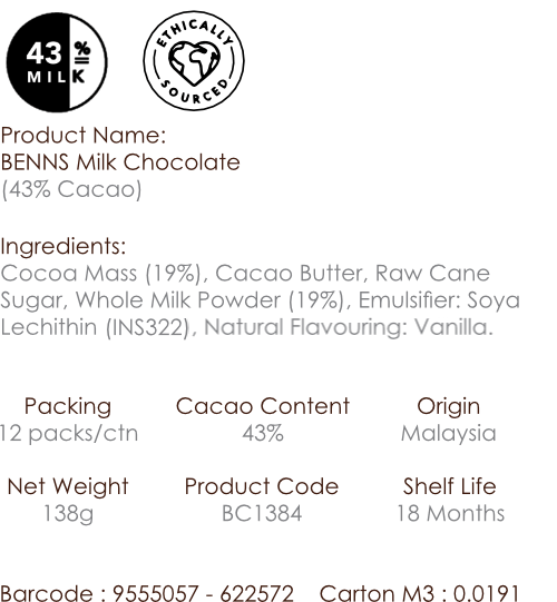 Creamy, velvetly chocolate made with real milk and robust flavoured Malaysia cacao beans that produce a first-rate chocolatey note.